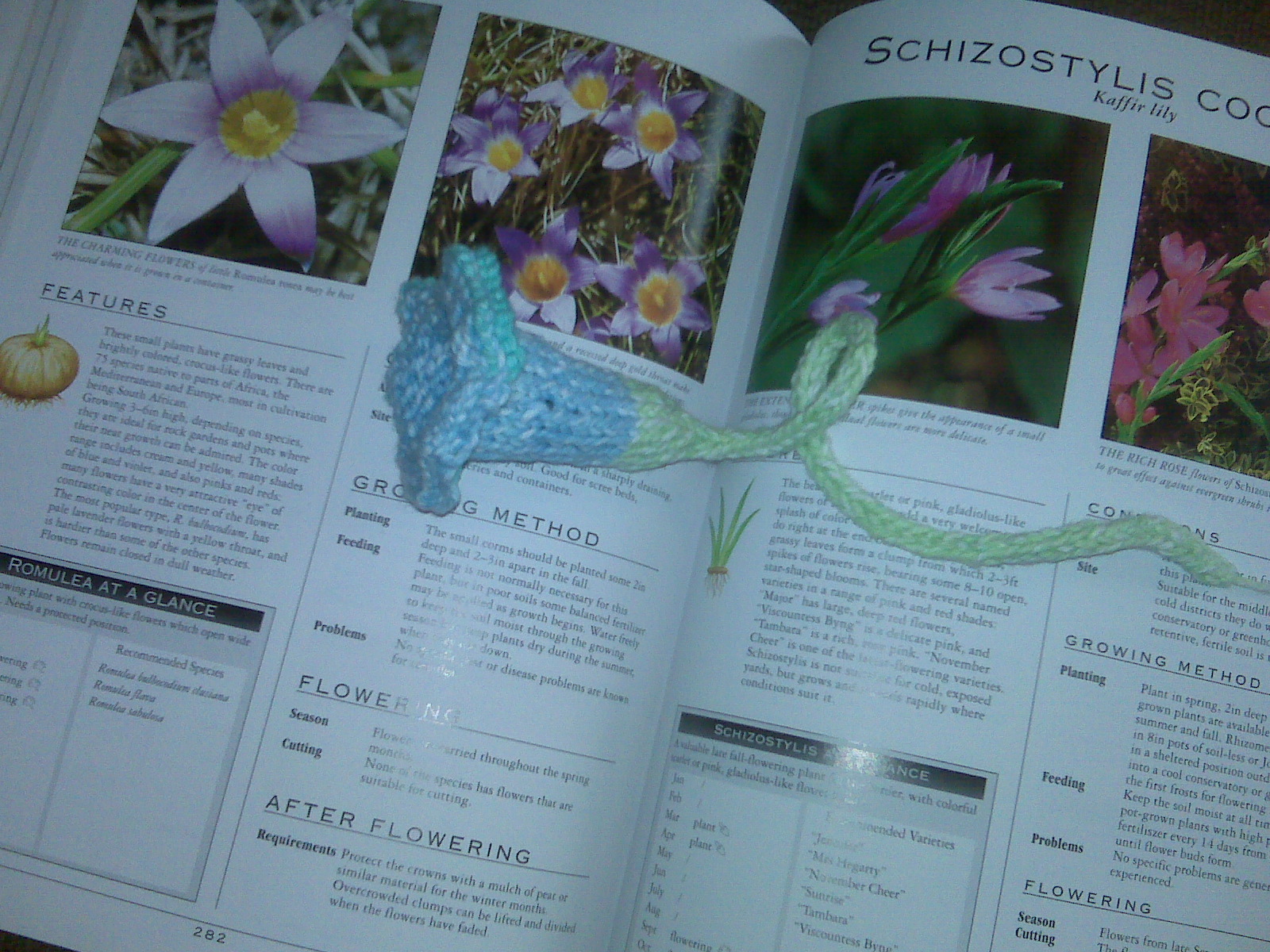 Knitting and flowers! Yay! This is a bookmark. I found the pattern in a fabulous calendar that a co-worker gave me as a Christmas gift. (Yes, my co-workers know that I love knitting THAT much!) I took the picture of it on my Gardening Encyclopedia because I'm just that cool...hahah. So here is the pic...I can't wait to improvise some more of these cute little creations...what do you think?